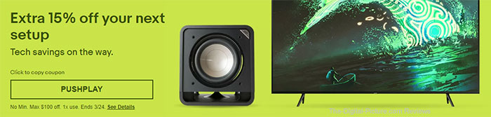Apply coupon code PUSHPLAY (no min, max $100 off, 1x use, ends 3/24, full terms and conditions available at eBay) at checkout to save 15% on a wide range of tech gear.